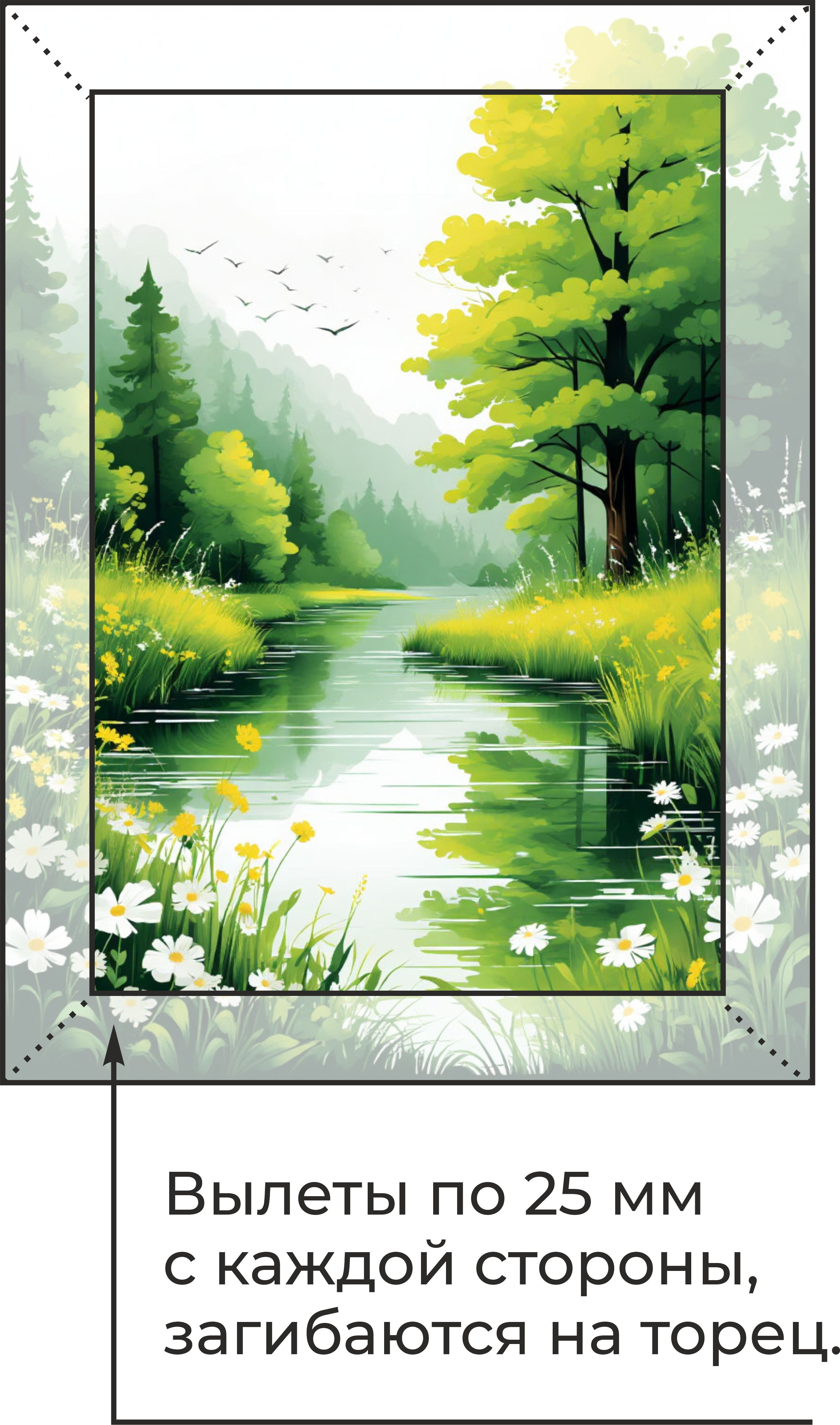 Например, для картины на холсте размером 400х600 мм макет должен быть размером 450х650 мм. По 25 мм с каждой стороны будет подвёрнуто на торец.