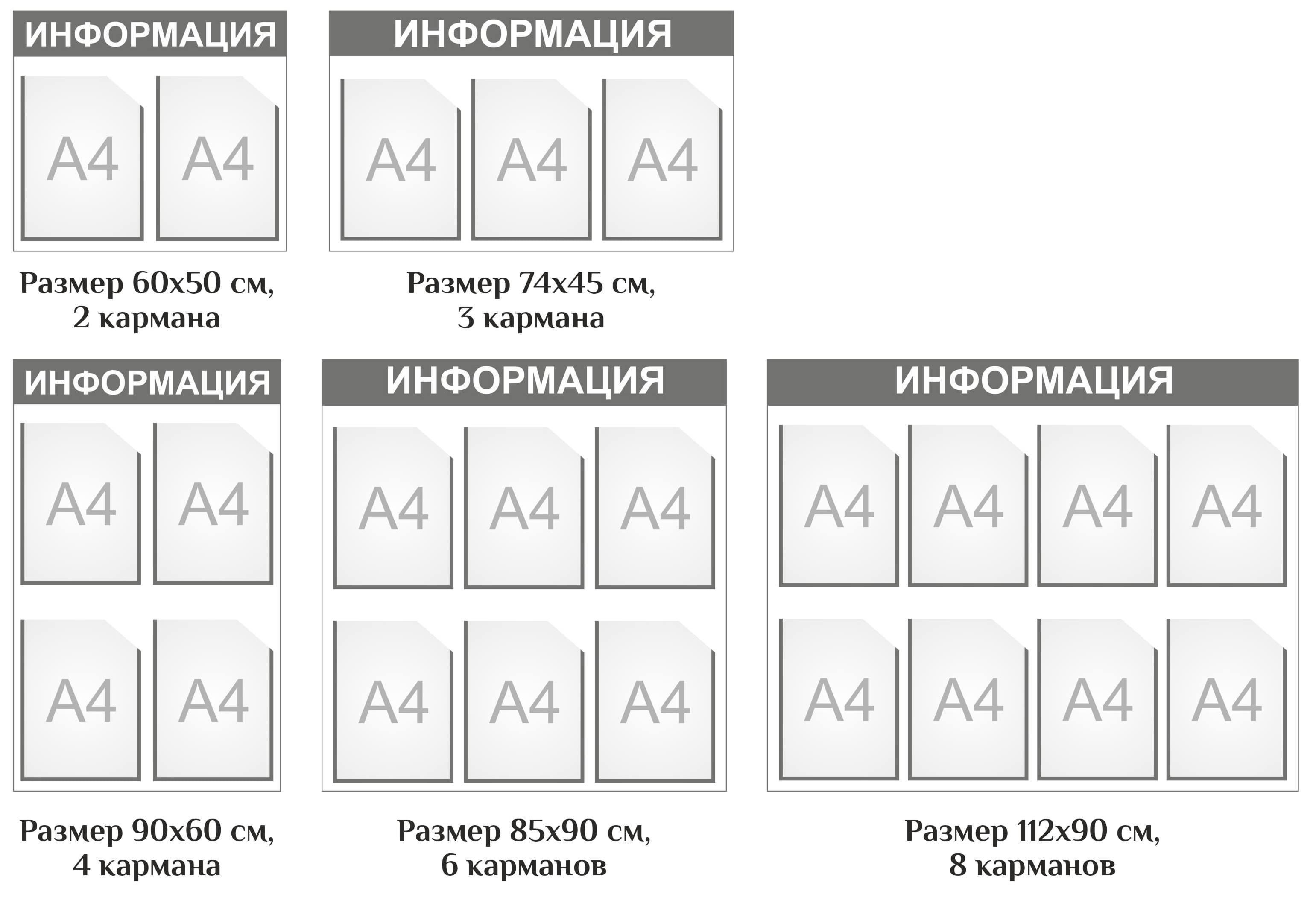 Размер 90х60 см, ПВХ 3 мм, самокл. пленка, 4 плоских кармана А4 формата (ПЭТ 0.5 мм) | 2550 |
